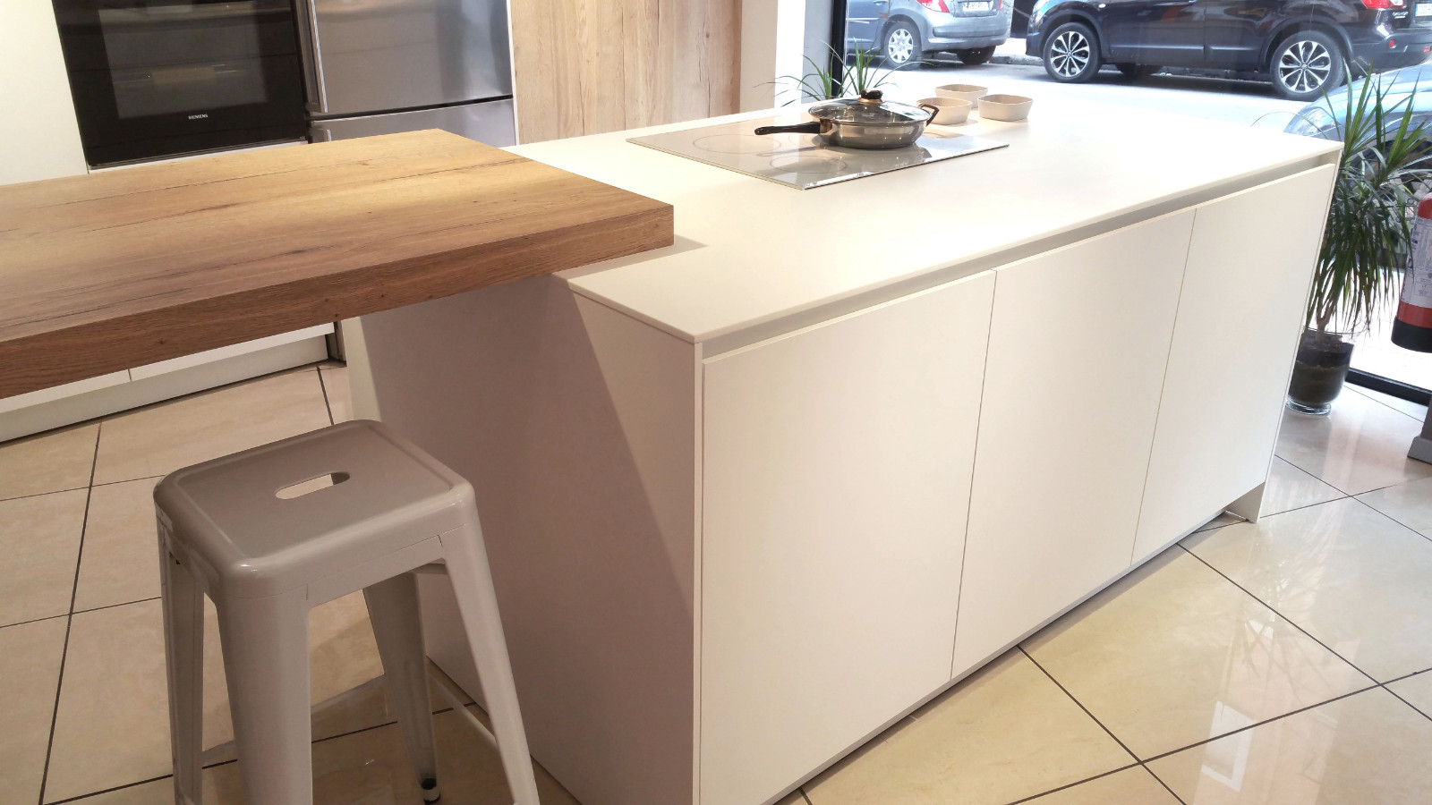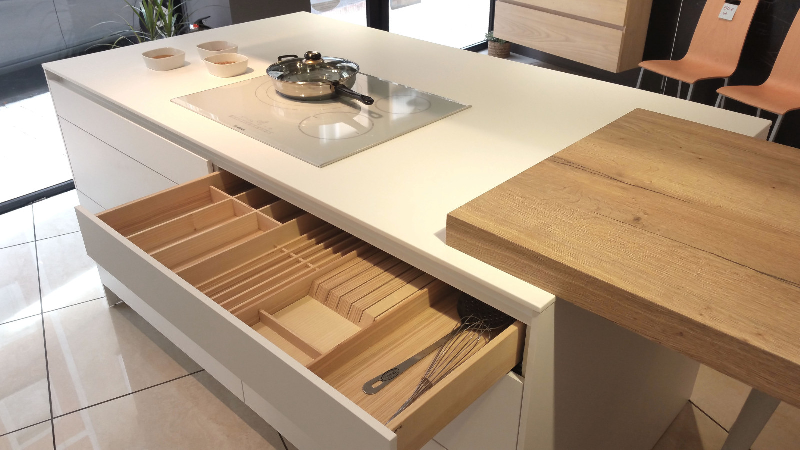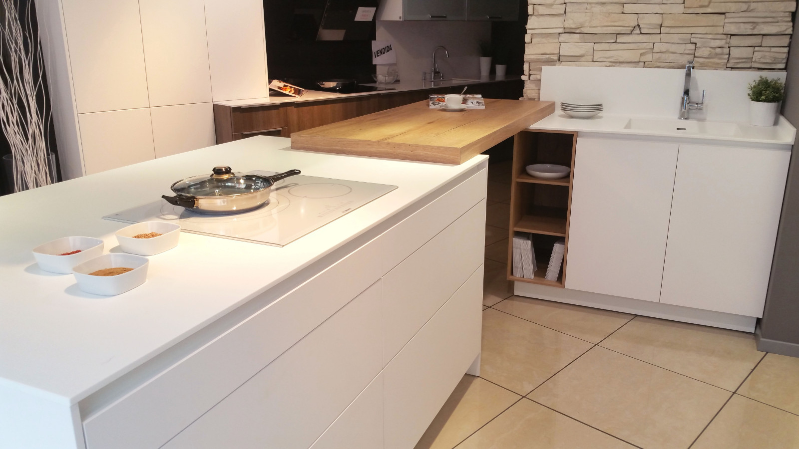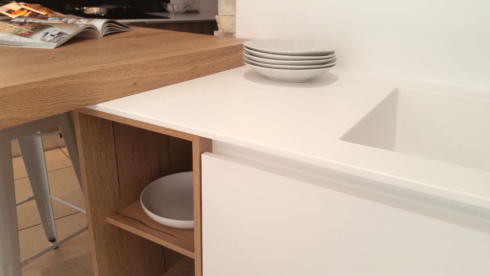 Modelo LINE-E 13 en Blanco Innsbruck de SANTOS. Limpieza perfecta cuando buscas un acabado cómodo. Encimeras Krion Snow White de Porcelanosa, las encimeras sin juntas.