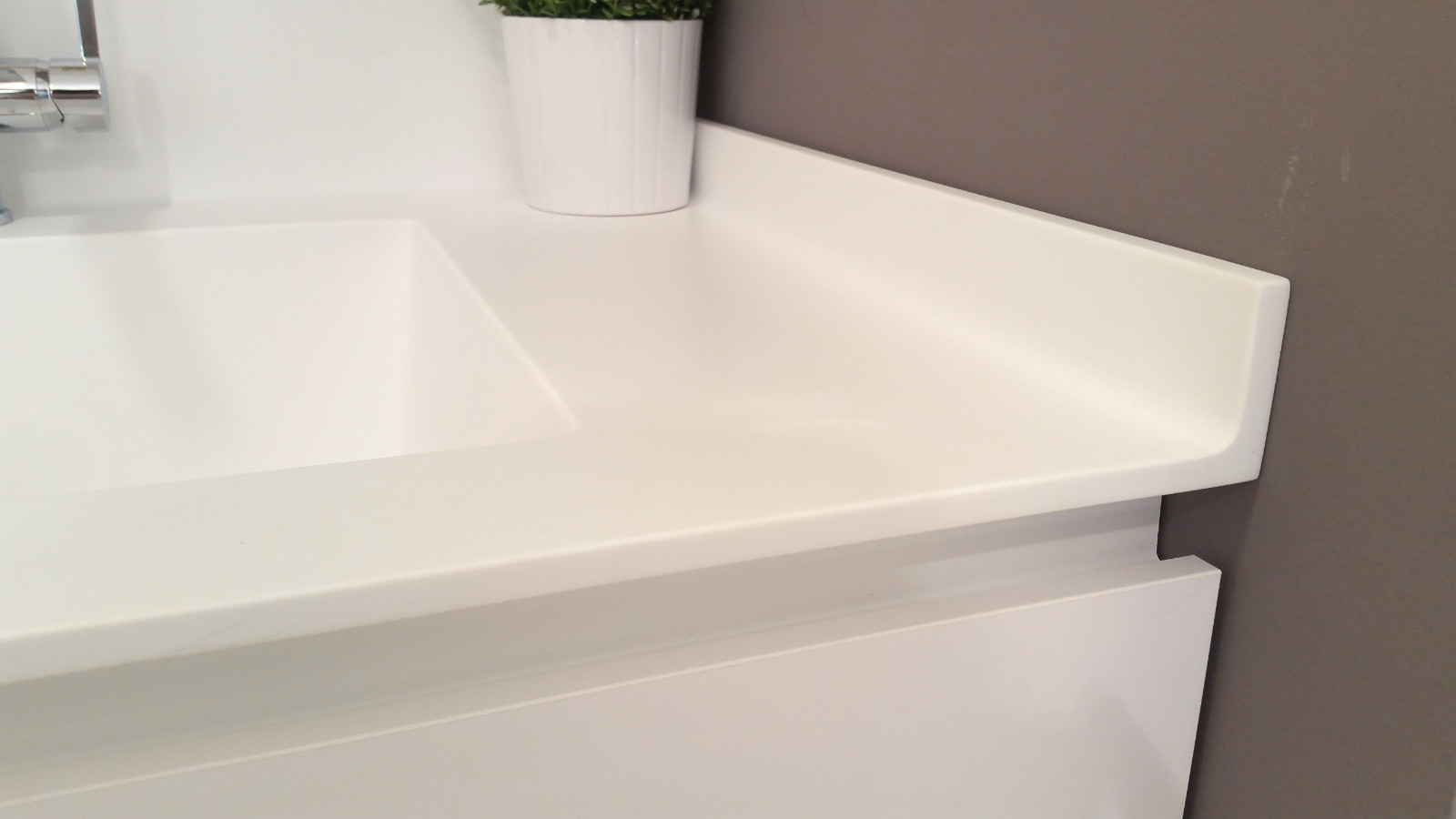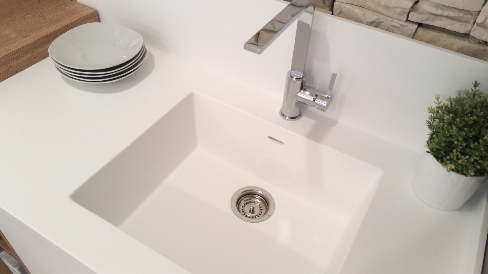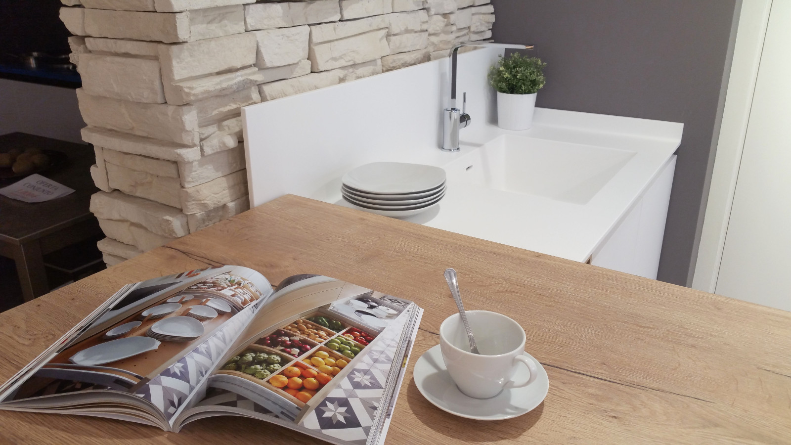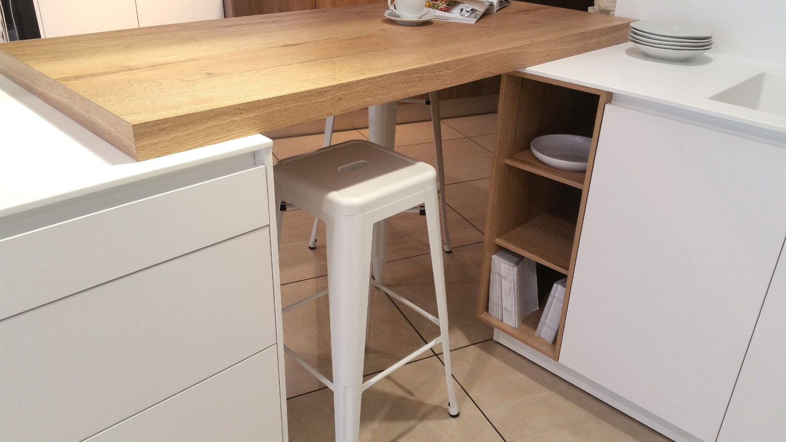 Modelo LINE-E 13 en Blanco Innsbruck de SANTOS. Limpieza perfecta cuando buscas un acabado cómodo. Encimeras Krion Snow White de Porcelanosa, las encimeras sin juntas.